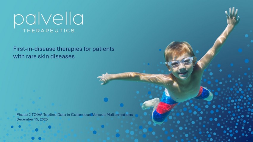 WAYNE, Pa., December 15, 2025 (GLOBE NEWSWIRE) — (Nasdaq: PVLA) Palvella Therapeutics, Inc. (Palvella or “the Company”), a clinical-stage biopharmaceutical company focused on developing and commercializing novel therapies to treat patients suffering from serious, rare skin diseases for which there are no U.S. Food and Drug Administration (FDA)-approved therapies, today announced positive topline results from the Company’s Phase 2 TOIVA study of QTORIN™ 3.9% rapamycin anhydrous gel (QTORIN™ rapamycin) for the treatment of cutaneous venous malformations (cutaneous VMs).