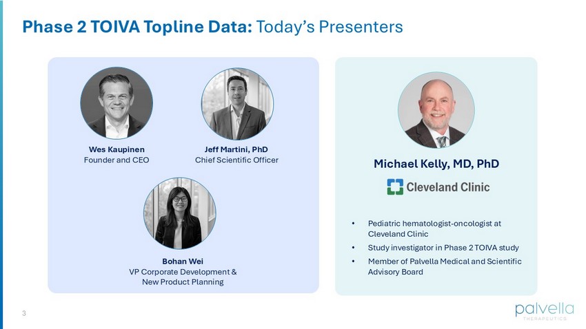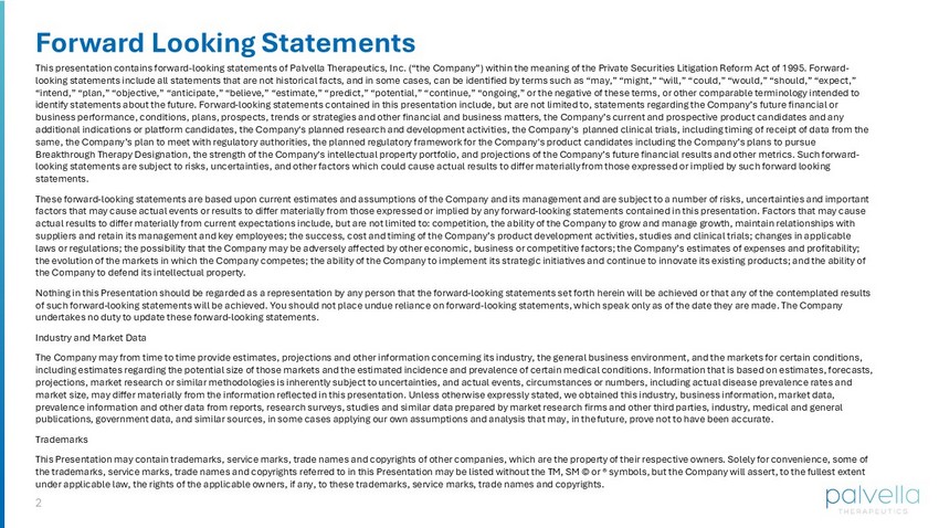 2 Forward Looking Statements This presentation contains forward - looking statements of Palvella Therapeutics, Inc. (“the Company”) within the meaning of the P rivate Securities Litigation Reform Act of 1995. Forward - looking statements include all statements that are not historical facts, and in some cases, can be identified by terms such a s “ may,” “might,” “will,” “could,” “would,” “should,” “expect,” “intend,” “plan,” “objective,” “anticipate,” “believe,” “estimate,” “predict,” “potential,” “continue,” “ongoing,” or the neg ati ve of these terms, or other comparable terminology intended to identify statements about the future. Forward - looking statements contained in this presentation include, but are not limited to, statements regarding the Company’s future financial or business performance, conditions, plans, prospects, trends or strategies and other financial and business matters, the Compan y’s current and prospective product candidates and any additional indications or platform candidates, the Company's planned research and development activities, the Company's plan ned clinical trials, including timing of receipt of data from the same, the Company’s plan to meet with regulatory authorities, the planned regulatory framework for the Company's product cand ida tes including the Company’s plans to pursue Breakthrough Therapy Designation, the strength of the Company's intellectual property portfolio, and projections of the Compa ny’ s future financial results and other metrics. Such forward - looking statements are subject to risks, uncertainties, and other factors which could cause actual results to differ material ly from those expressed or implied by such forward looking statements. These forward - looking statements are based upon current estimates and assumptions of the Company and its management and are subj ect to a number of risks, uncertainties and important factors that may cause actual events or results to differ materially from those expressed or implied by any forward - looking stat ements contained in this presentation. Factors that may cause actual results to differ materially from current expectations include, but are not limited to: competition, the ability of th e C ompany to grow and manage growth, maintain relationships with suppliers and retain its management and key employees; the success, cost and timing of the Company’s product development acti vit ies, studies and clinical trials; changes in applicable laws or regulations; the possibility that the Company may be adversely affected by other economic, business or competitive fa cto rs; the Company’s estimates of expenses and profitability; the evolution of the markets in which the Company competes; the ability of the Company to implement its strategic initiatives an d continue to innovate its existing products; and the ability of the Company to defend its intellectual property. Nothing in this Presentation should be regarded as a representation by any person that the forward - looking statements set forth herein will be achieved or that any of the contemplated results of such forward - looking statements will be achieved. You should not place undue reliance on forward - looking statements, which sp eak only as of the date they are made. The Company undertakes no duty to update these forward - looking statements. Industry and Market Data The Company may from time to time provide estimates, projections and other information concerning its industry, the general b usi ness environment, and the markets for certain conditions, including estimates regarding the potential size of those markets and the estimated incidence and prevalence of certain medic al conditions. Information that is based on estimates, forecasts, projections, market research or similar methodologies is inherently subject to uncertainties, and actual events, circumstance s o r numbers, including actual disease prevalence rates and market size, may differ materially from the information reflected in this presentation. Unless otherwise expressly stated, we ob tained this industry, business information, market data, prevalence information and other data from reports, research surveys, studies and similar data prepared by market research fi rms and other third parties, industry, medical and general publications, government data, and similar sources, in some cases applying our own assumptions and analysis that may, in the fut ure, prove not to have been accurate. Trademarks This Presentation may contain trademarks, service marks, trade names and copyrights of other companies, which are the propert y o f their respective owners. Solely for convenience, some of the trademarks, service marks, trade names and copyrights referred to in this Presentation may be listed without the TM, SM © or ® symbols, but the Company will assert, to the fullest extent under applicable law, the rights of the applicable owners, if any, to these trademarks, service marks, trade names and copyri ght s.