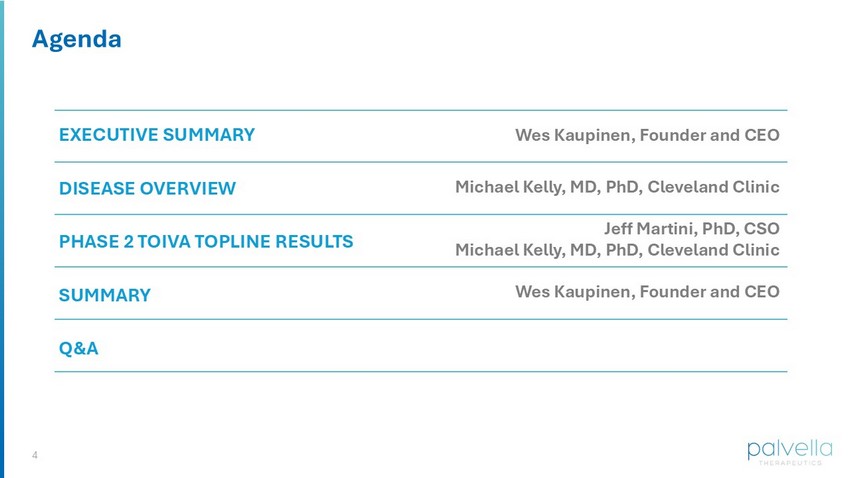 3 Phase 2 TOIVA Topline Data : Today’s Presenters Michael Kelly , MD, PhD • Pediatric hematologist - oncologist at Cleveland Clinic • Study investigator in Phase 2 TOIVA study • Member of Palvella Medical and Scientific Advisory Board Bohan Wei VP Corporate Development & New Product Planning Wes Kaupinen Founder and CEO Jeff Martini, PhD Chief Scientific Officer