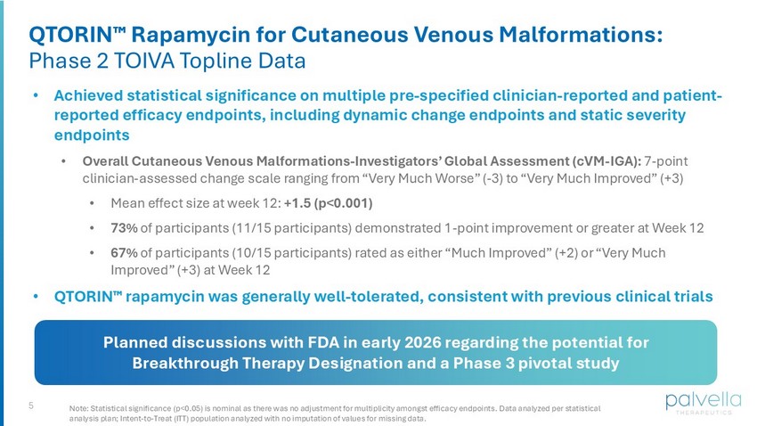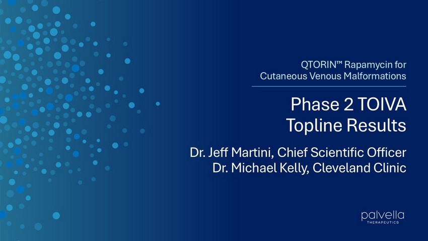 "Based on the strength of the Phase 2 TOIVA results, including the 73% of participants who improved on the Overall cVM-IGA at Week 12, Palvella is planning for near-term discussions with FDA regarding the potential for Breakthrough Therapy Designation and a Phase 3 pivotal study, as well as the newly announced Plausible Mechanism Pathway," said Wes Kaupinen, Founder and Chief Executive Officer of Palvella. “We are deeply grateful to the patients and families who participated in this trial, as well as the investigators and clinical centers whose partnership made this study possible. These data reinforce our conviction in the therapeutic potential of QTORIN™ rapamycin, the strength of the QTORIN™ platform, and our long-term vision to become the leading rare disease company focused on developing and commercializing novel therapies for patients with serious, rare skin diseases.”