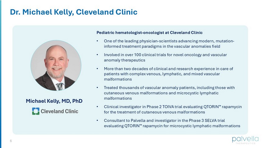 6 Dr. Michael Kelly, Cleveland Clinic Pediatric hematologist - oncologist at Cleveland Clinic • One of the leading physician - scientists advancing modern, mutation - informed treatment paradigms in the vascular anomalies field • Involved in over 100 clinical trials for novel oncology and vascular anomaly therapeutics • More than two decades of clinical and research experience in care of patients with complex venous, lymphatic, and mixed vascular malformations • Treated thousands of vascular anomaly patients, including those with cutaneous venous malformations and microcystic lymphatic malformations • Clinical investigator in Phase 2 TOIVA trial evaluating QTORIN rapamycin for the treatment of cutaneous venous malformations • Consultant to Palvella and investigator in the Phase 3 SELVA trial evaluating QTORIN rapamycin for microcystic lymphatic malformations Michael Kelly , MD, PhD