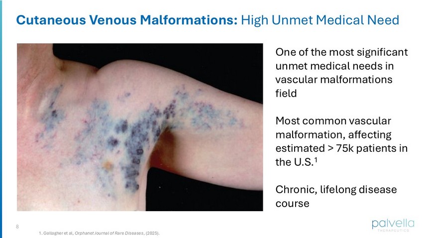 Cutaneous VMs are a rare genetic disease caused by mutations in genes that cause overactivation of the PI3K/mTOR signaling pathway, leading to dysfunctional veins within the skin. These malformations can cause substantial morbidity and functional impairment, significantly impact quality of life, and are associated with severe bleeding, thrombosis, and other potential complications. An urgent need exists for an FDA-approved, targeted, localized therapy to treat cutaneous VMs. While published case studies and real-world evidence have provided preliminary evidence of clinical benefit from the off-label use of systemic mTOR inhibitors for venous malformations, there are currently no FDA-approved therapies for the estimated more than 75,000 diagnosed patients with cutaneous VMs in the U.S.