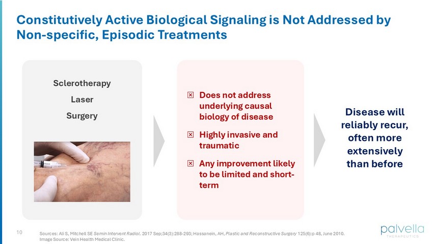 10 Constitutively Active Biological Signaling is Not Addressed by Non - specific, Episodic Treatments Sclerotherapy Laser Surgery ⮽ Does not address underlying causal biology of disease ⮽ Highly invasive and traumatic ⮽ Any improvement likely to be limited and short - term Disease will reliably recur, often more extensively than before Sources: Ali S, Mitchell SE Semin Intervent Radiol . 2017 Sep;34(3):288 - 293; Hassanein, AH, Plastic and Reconstructive Surgery 125(6):p 48, June 2010. Image Source: Vein Health Medical Clinic.