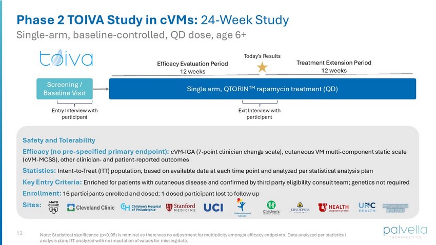 12 Venous Malformations: Progress Towards the Potential First Targeted Therapy for Unaddressed Cutaneous Disease Known Genetics / Clear Biology Real - world Evidence Real - world evidence supports rapamycin’s off - label use in primarily internal manifestations of VMs… …however, poor patient outcomes persist in cutaneous disease Limaye et al (2009, 2015) Teng et al (2025) QTORIN RAPAMYCIN On Target, In Tissue Phase 2 TOIVA Data (2025) Plausible mechanism 3.9% concentration Dermal penetration Extensive CMC package QTORIN 3.9% rapamycin anhydrous gel is for investigational use only and has not been approved or cleared by the FDA or by any other regulatory agency. The safety or efficacy has not been established for any use.