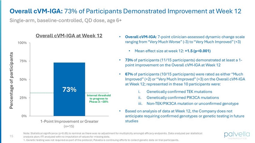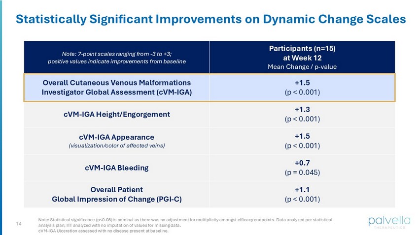 14 Statistically Significant Improvements on Dynamic Change Scales Participants (n=15) at Week 12 Mean Change / p - value Note: 7 - point scales ranging from - 3 to +3; positive values indicate improvements from baseline +1.5 (p < 0.001) Overall Cutaneous Venous Malformations Investigator Global Assessment (cVM - IGA) +1.3 (p < 0.001) cVM - IGA Height/Engorgement +1.5 (p < 0.001) cVM - IGA Appearance (visualization/color of affected veins) +0.7 (p = 0.045) cVM - IGA Bleeding +1.1 (p < 0.001) Overall Patient Global Impression of Change (PGI - C) Note: Statistical significance (p<0.05) is nominal as there was no adjustment for multiplicity amongst efficacy endpoints. Data analyzed per statistical analysis plan; ITT analyzed with no imputation of values for missing data. cVM - IGA Ulceration assessed with no disease present at baseline.