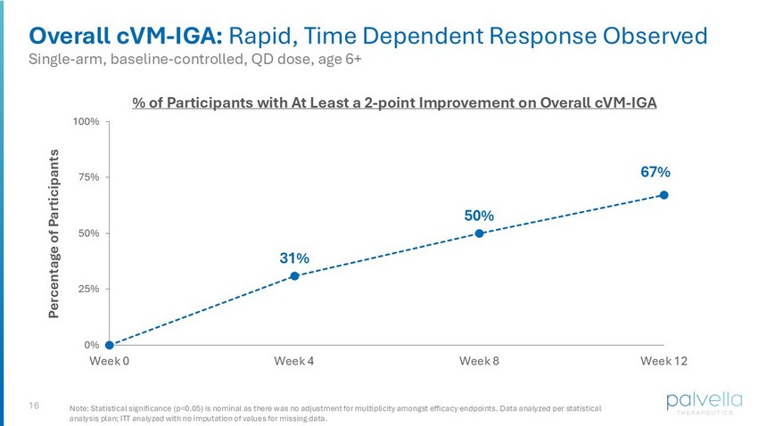 15 Overall cVM - IGA: 73% of Participants Demonstrated Improvement at Week 12 Single - arm, baseline - controlled, QD dose, age 6+ • Overall cVM - IGA: 7 - point clinician - assessed dynamic change scale ranging from “Very Much Worse” ( - 3) to “Very Much Improved” (+3) • Mean effect size at week 12: +1.5 (p<0.001) • 73% of participants (11/15 participants) demonstrated at least a 1 - point improvement on the Overall cVM - IGA at Week 12 • 67% of participants (10/15 participants) were rated as either “Much Improved” (+2) or “Very Much Improved” (+3) on the Overall cVM - IGA at Week 12; represented in these 10 participants were: i. Genetically confirmed TEK mutations ii. Genetically confirmed PIK3CA mutations iii. Non - TEK/PIK3CA mutation or unconfirmed genotype • Based on analysis of data at Week 12, the Company does not anticipate requiring confirmed genotypes or genetic testing in future studies Overall cVM - IGA at Week 12 (n=15) Internal threshold to progress to Phase 3: ~30% Note: Statistical significance (p<0.05) is nominal as there was no adjustment for multiplicity amongst efficacy endpoints. Data analyzed per statistical analysis plan; ITT analyzed with no imputation of values for missing data. 1. Genetic testing was not required as part of the protocol; Palvella is continuing efforts to collect genetic data on trial par ticipants. 73% 0% 25% 50% 75% 100% 1-Point Improvement or Greater Percentage of participants