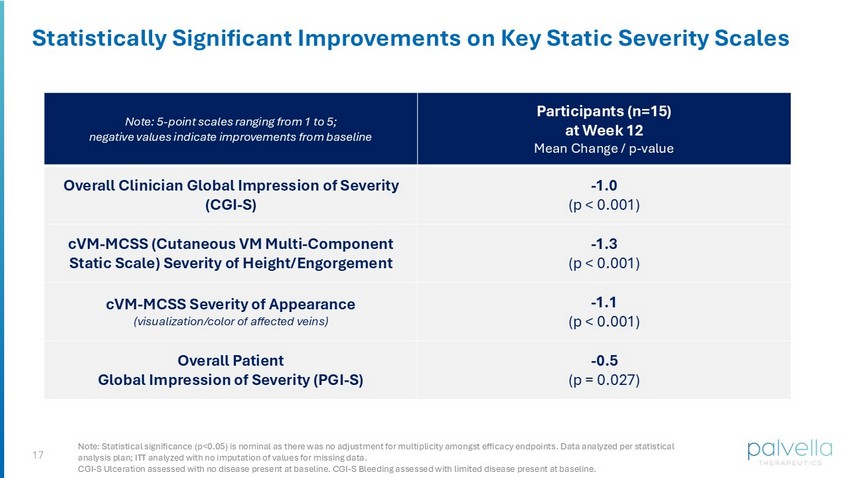 17 Statistically Significant Improvements on Key Static Severity Scales Participants (n=15) at Week 12 Mean Change / p - value Note: 5 - point scales ranging from 1 to 5; negative values indicate improvements from baseline - 1.0 (p < 0.001) Overall Clinician Global Impression of Severity (CGI - S) - 1.3 (p < 0.001) cVM - MCSS (Cutaneous VM Multi - Component Static Scale) Severity of Height/Engorgement - 1.1 (p < 0.001) cVM - MCSS Severity of Appearance (visualization/color of affected veins) - 0.5 (p = 0.027) Overall Patient Global Impression of Severity (PGI - S) Note: Statistical significance (p<0.05) is nominal as there was no adjustment for multiplicity amongst efficacy endpoints. Data analyzed per statistical analysis plan; ITT analyzed with no imputation of values for missing data. CGI - S Ulceration assessed with no disease present at baseline. CGI - S Bleeding assessed with limited disease present at baseline.