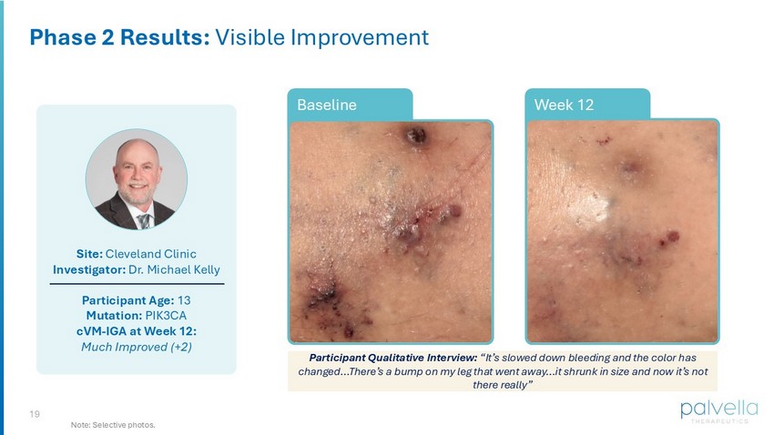 18 Site: CHOP Investigator: Dr. Denise Adams Participant Age: 17 Mutation: TEK cVM - IGA at Week 12: Very Much Improved (+3) Week 12 Baseline Phase 2 Results: Visible Improvement Participant Qualitative Interview: “I’ve definitely noticed some improvements…it’s definitely had a positive effect…It’s more comfortable to wear a bra now…I’ve had less pain in that specific area” Note: Selective photos.