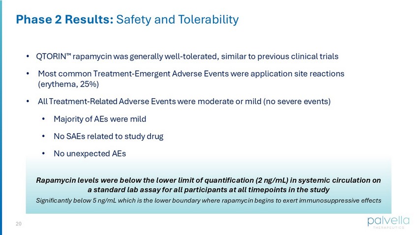 Similar to previous clinical trials of QTORIN™ rapamycin, in the Phase 2 TOIVA study QTORIN™ rapamycin was generally well-tolerated, with the most common treatment-emergent adverse events being application site reactions (erythema, 25%). All treatment-related adverse events were moderate or mild, with no unexpected adverse events reported. Rapamycin levels were below the lower limit of quantification (2 ng/mL) in systemic circulation on a standard lab assay for all participants at all timepoints in the study.