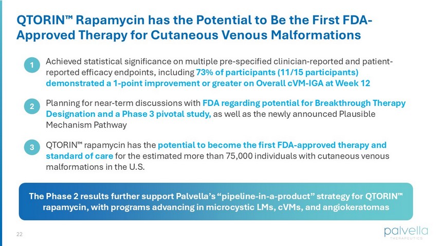 Based on Phase 2 results, Palvella to pursue near-term discussions with FDA regarding the potential for Breakthrough Therapy Designation and a Phase 3 pivotal study; FDA previously granted Fast Track Designation to QTORIN™ rapamycin for venous malformations